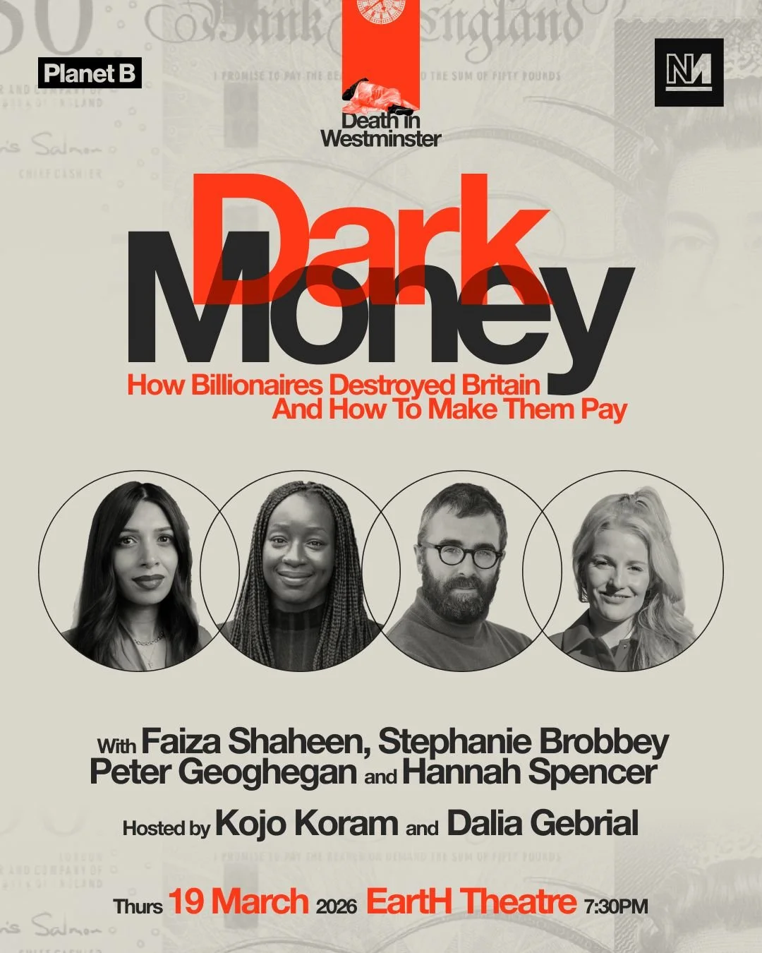 Planet B hosted this event with a live audience of 500 people at EartH, East London. It was chaired by Professor Kojo Koram and Dr Dalia Gebrial, who were joined by Peter Geoghegan, Stephanie Brobbey, Faiza Shaheen, and Hannah Spencer MP.